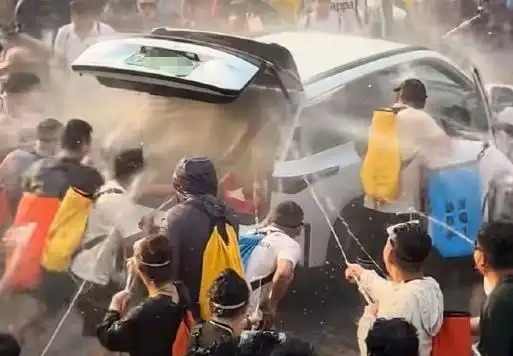 4月14日,云南西双版纳景洪市泼水节现场一汽车车门及后备厢被人强行拉开,多人向内喷水。